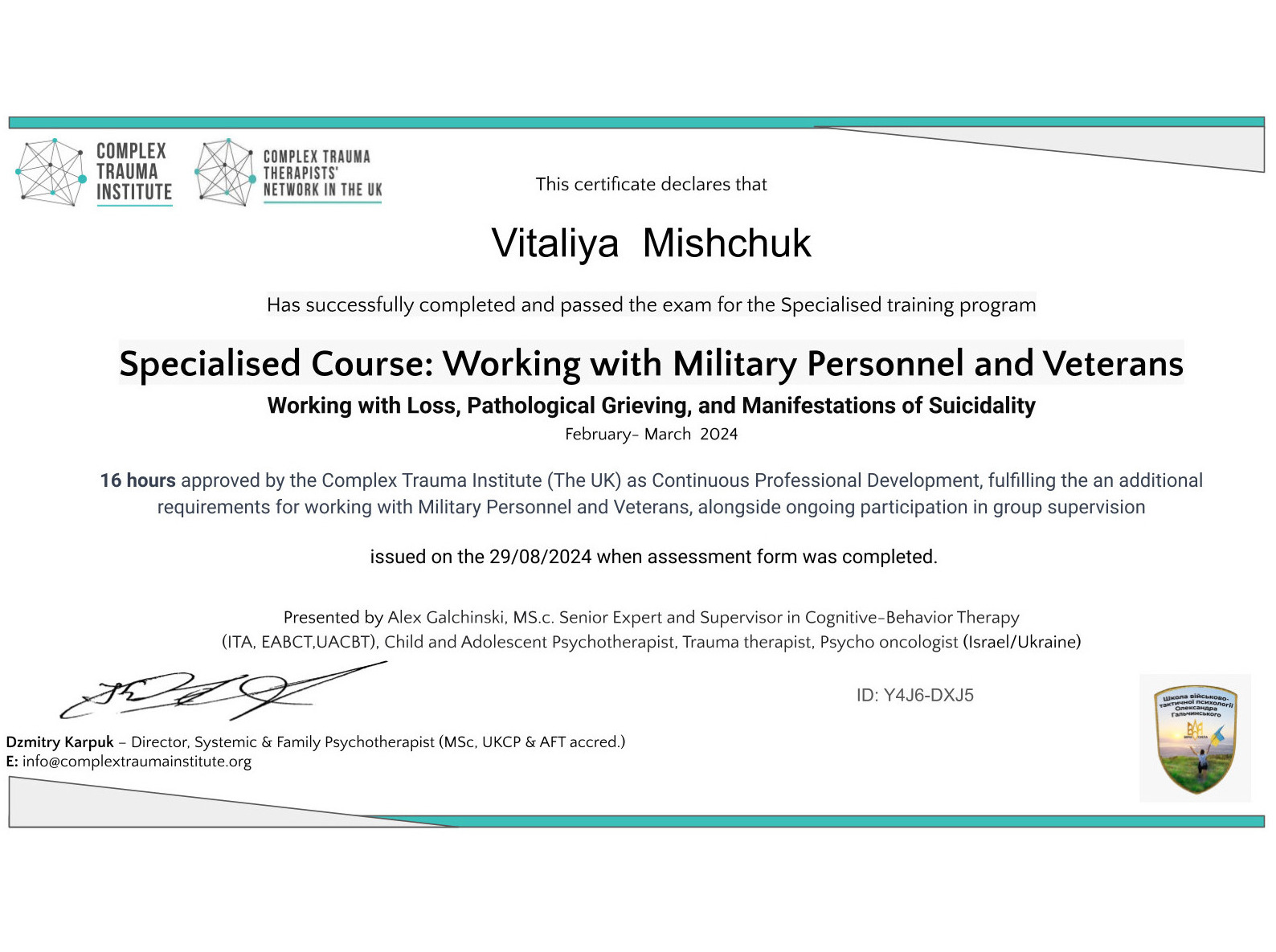 - Сертифікат Complex Trauma Institute (The UK) - Робота з військовими та ветеранами з 2024 року