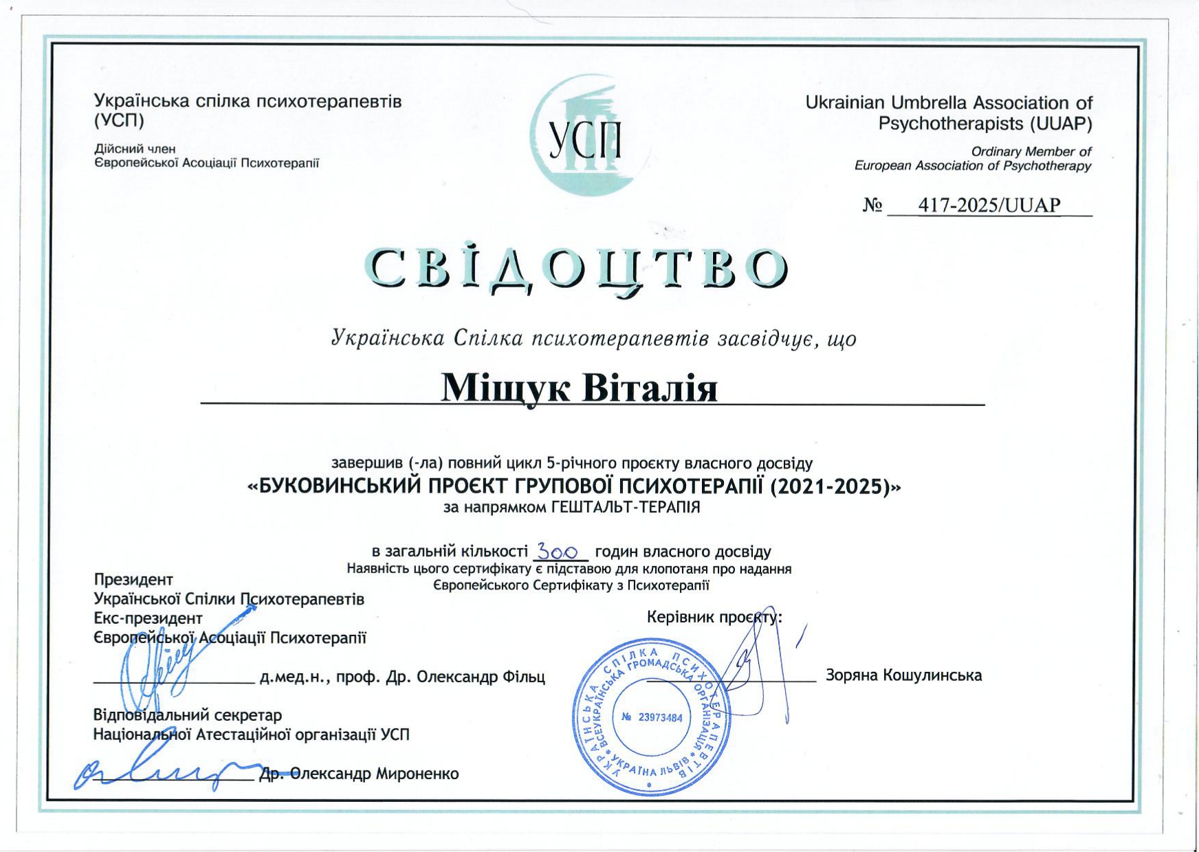 - Сертифікат Буковинський проект групової психотерапії з 2025 року