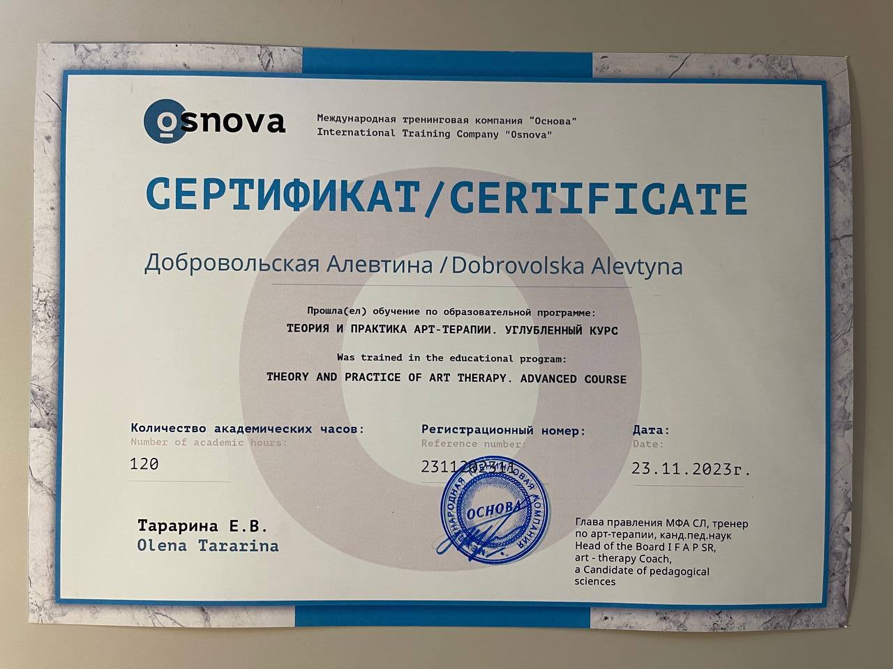 - Сертифікат платформа "Основа": глибинна арт-терапія, робота з метафоричними асоціативними картами з 2023 року