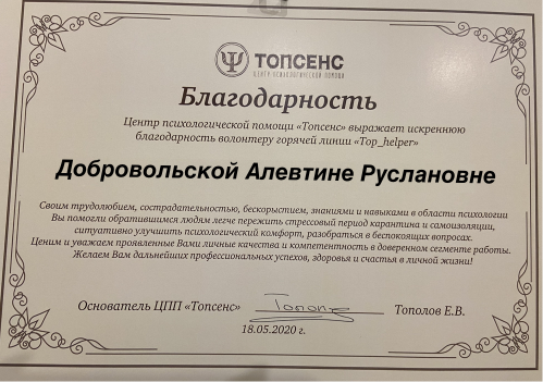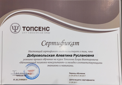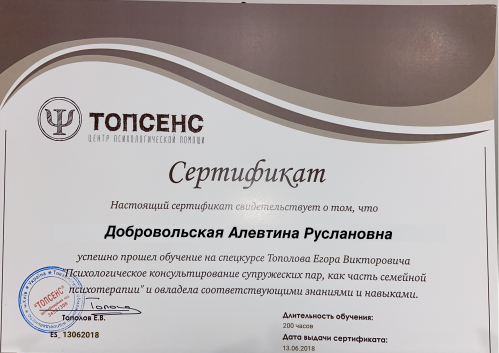 - Сертифікат психологічний центр "Топсенс": курс "Як захистити себе від маніпуляцій", курс "Подружня психотерапія", курс "Психолог-консультант" з 2021 року