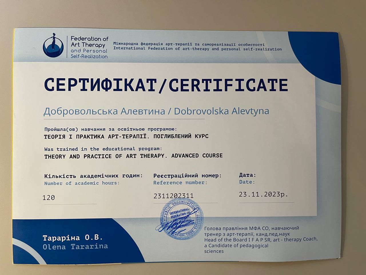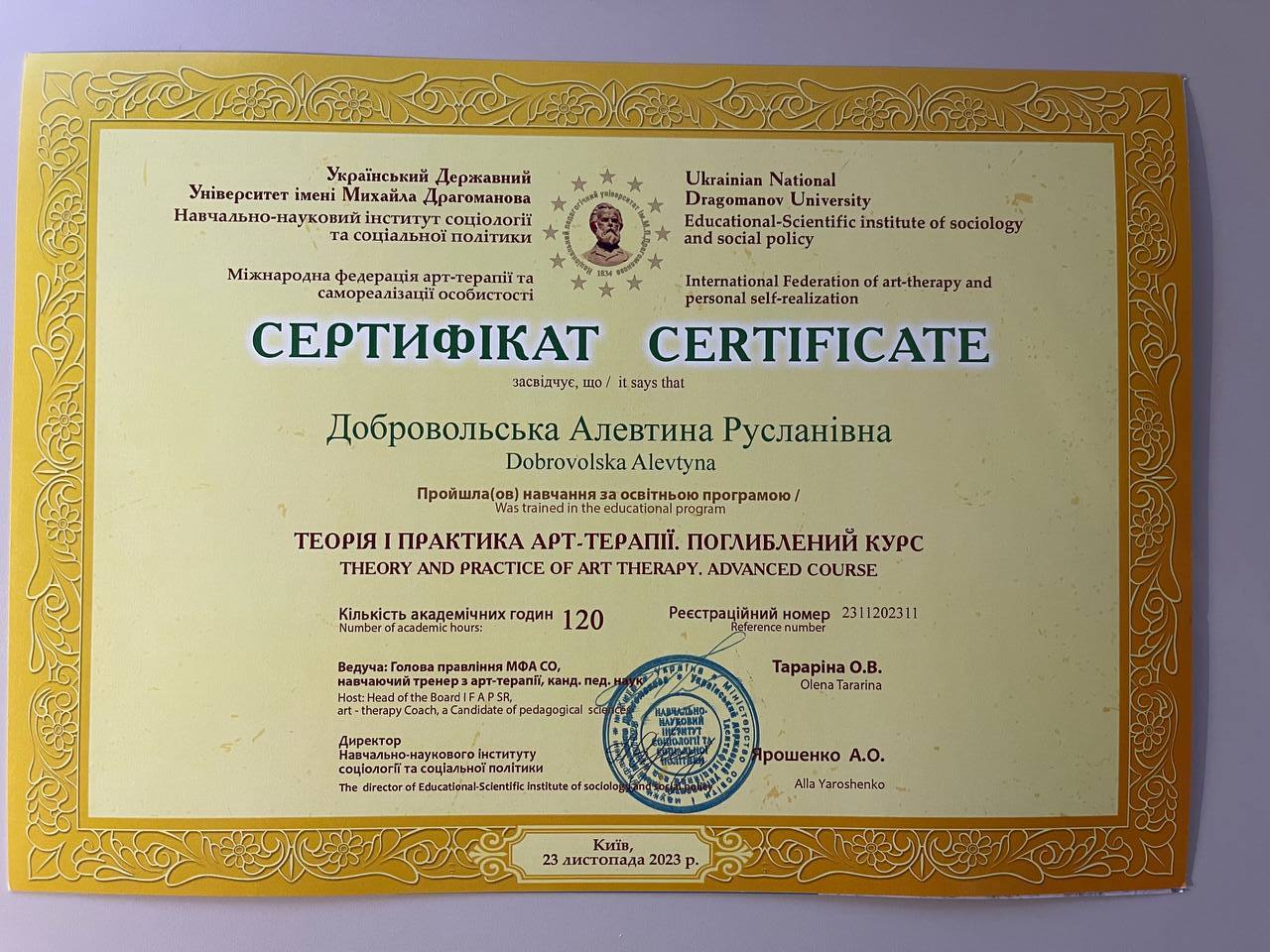 - Сертифікат Український державний університет імені Михайла Драгоманова: теорія і практика арт-терапії, поглиблений курс з 2023 року