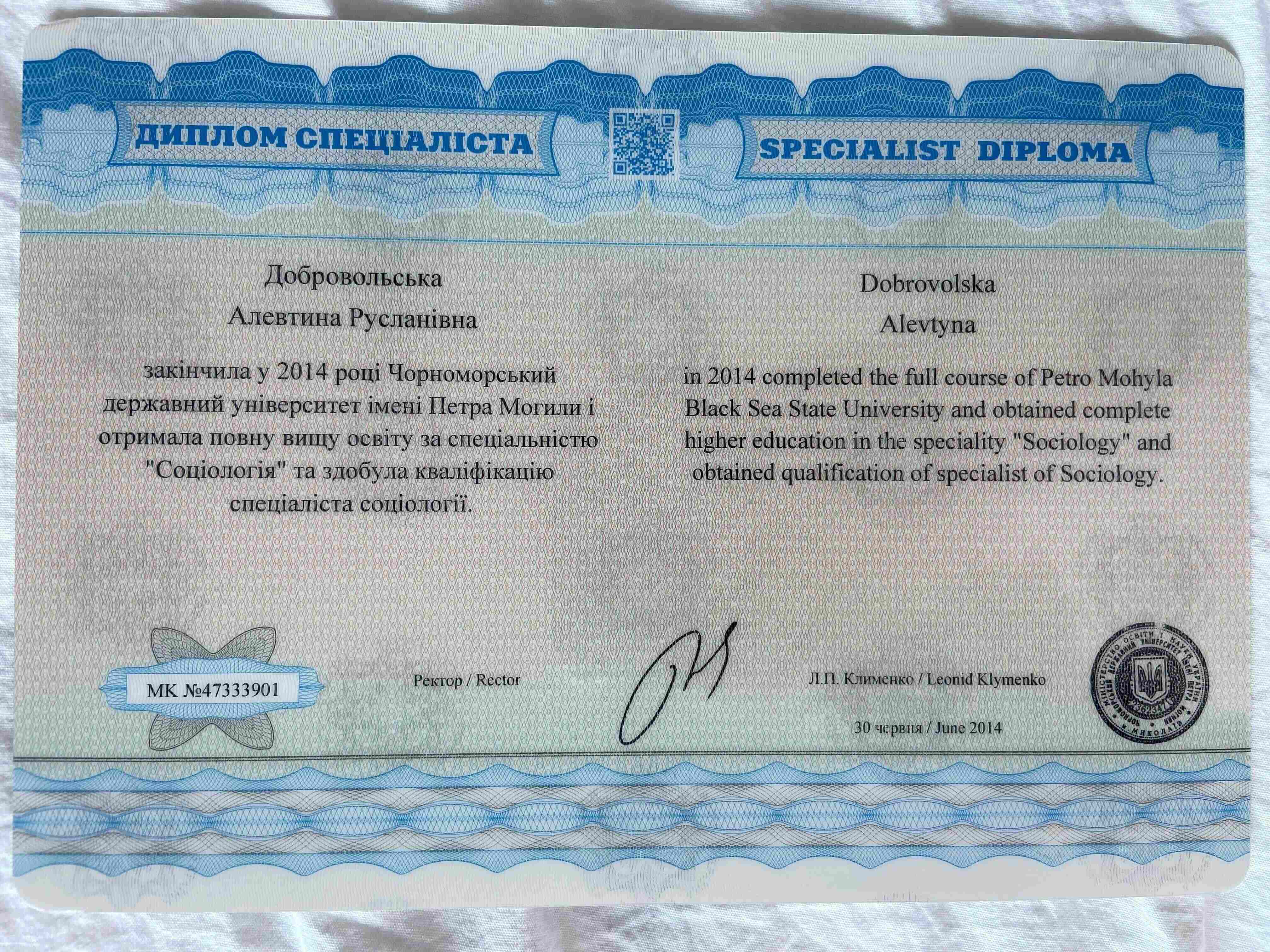 - перша вища освіта: Чорноморський державний університет імені Петра Могили (соціологія, основи психології, спеціаліст - 5 років навчання)