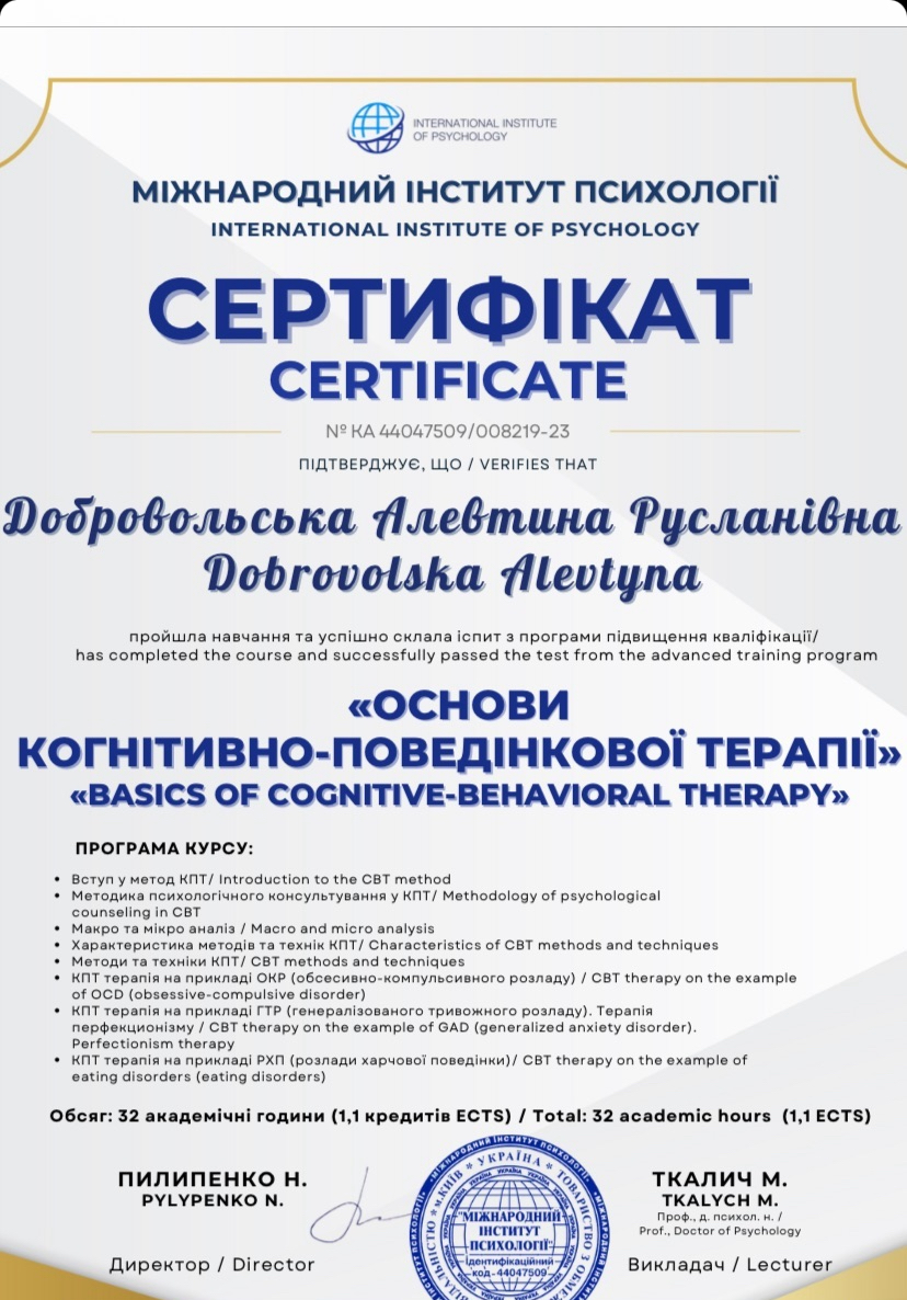 - Сертифікат Міжнародний інститут психології: курс "Основи когнітивно-поведінкової терапії" з 2023 року