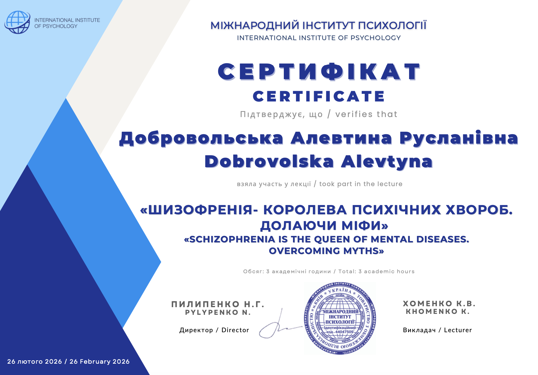 - Сертифікат Міжнародний інститут психології: курс "Шизофренія - королева психічних хвороб" з 2026 року