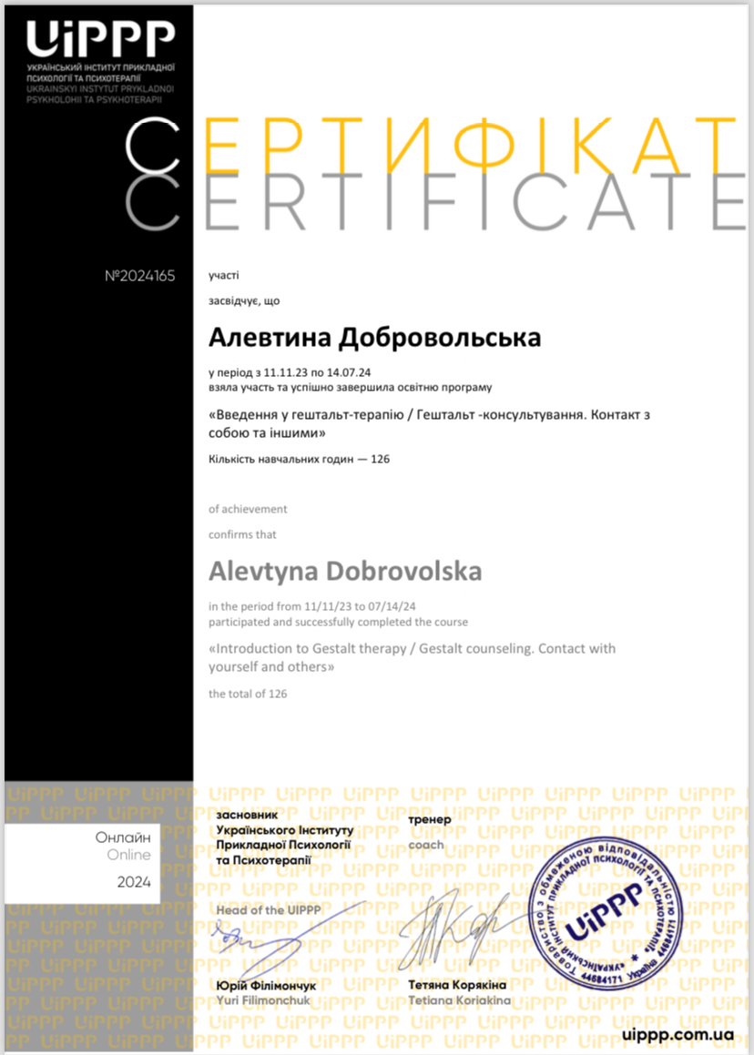 - Сертифікат Український інститут прикладної психології та психотерапії: курс "друга сходинка Гешталь-консультування" з 2028 року
