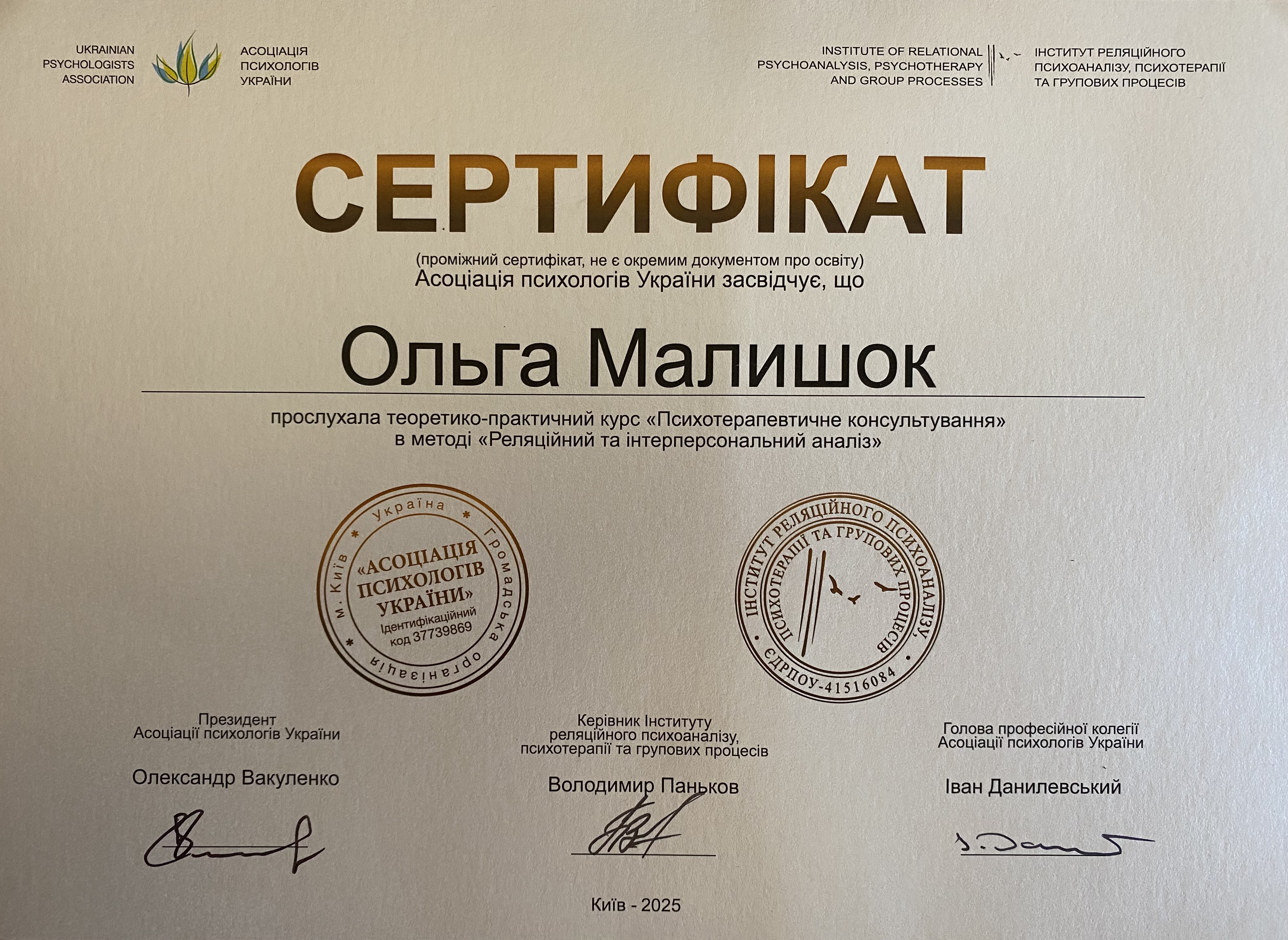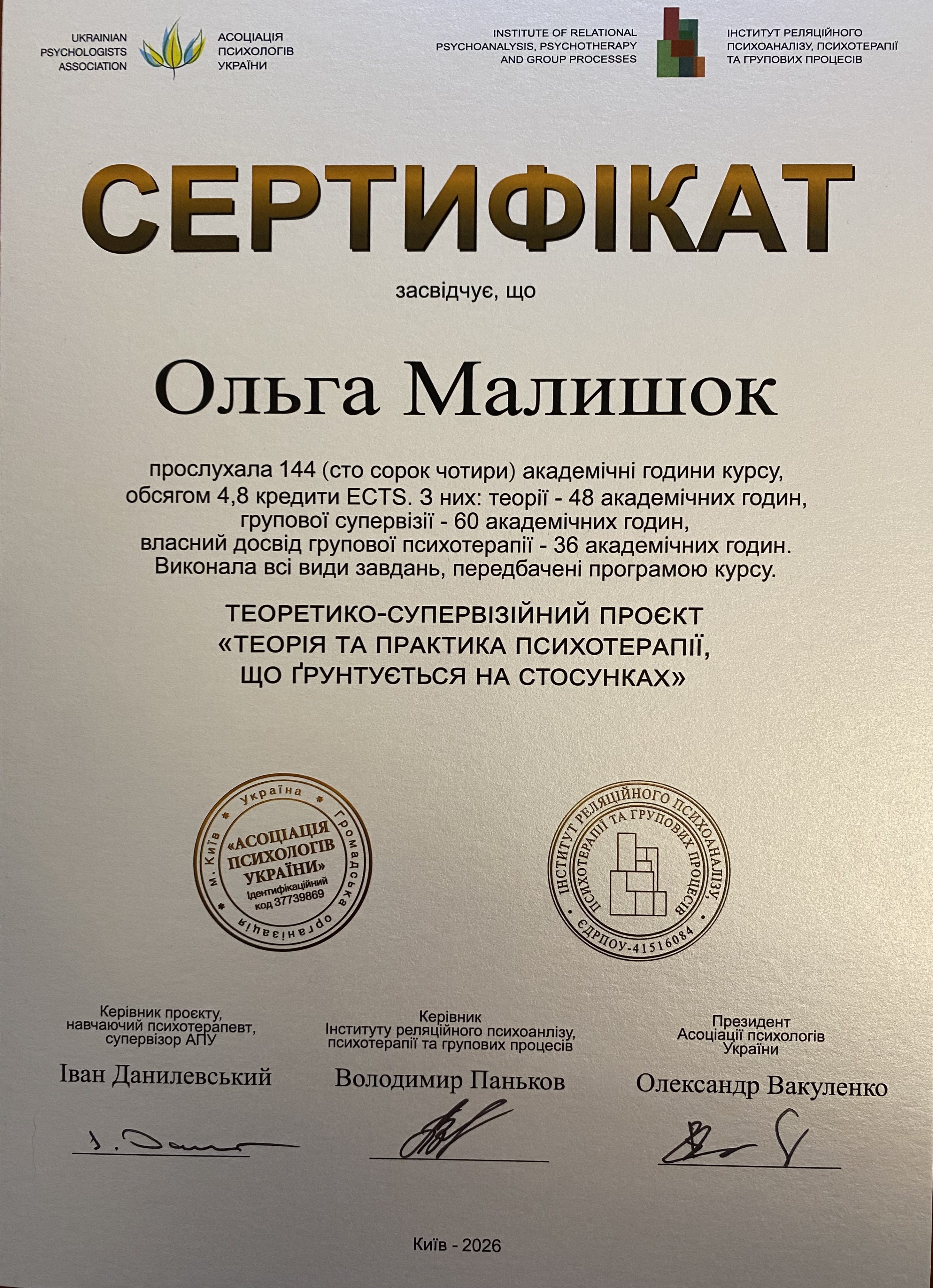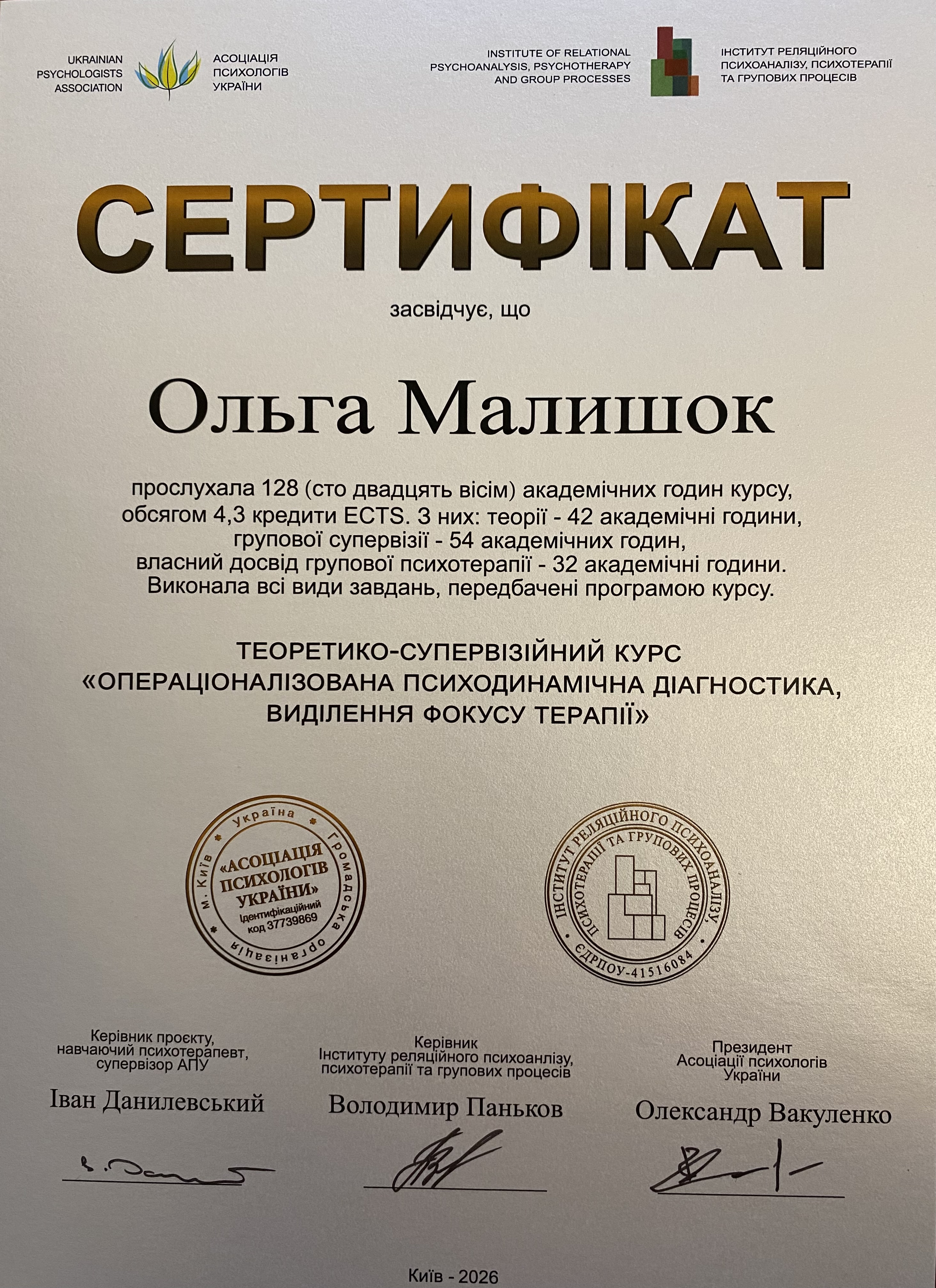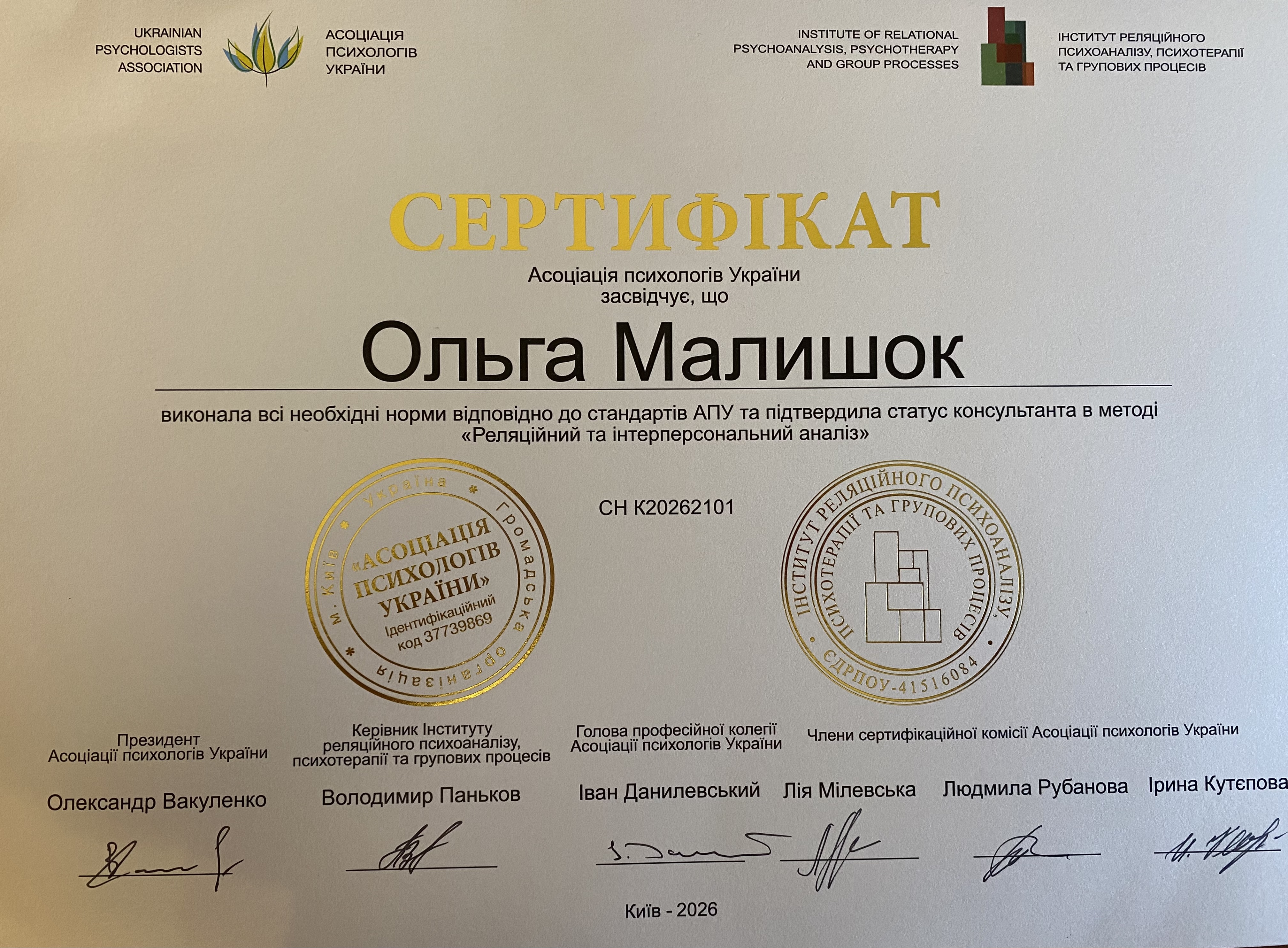 Вітаю! Я Ольга Малишок, психологиня за фахом, сертифікована консультантка та кандидатка на статус психотерапевта у методі Реляційний та інтерперсональний аналіз. Членкиня Асоціації психологів України та Української асоціації реляційного аналізу та психотерапії. Наші травми створюються у стосунках, і завдяки іншому, безпечному досвіду терапевтичних стосунків ми маємо шанс зцілитися та віднайти себе. Запрошую в роботу - у подорож до себе та розуміння інших.
