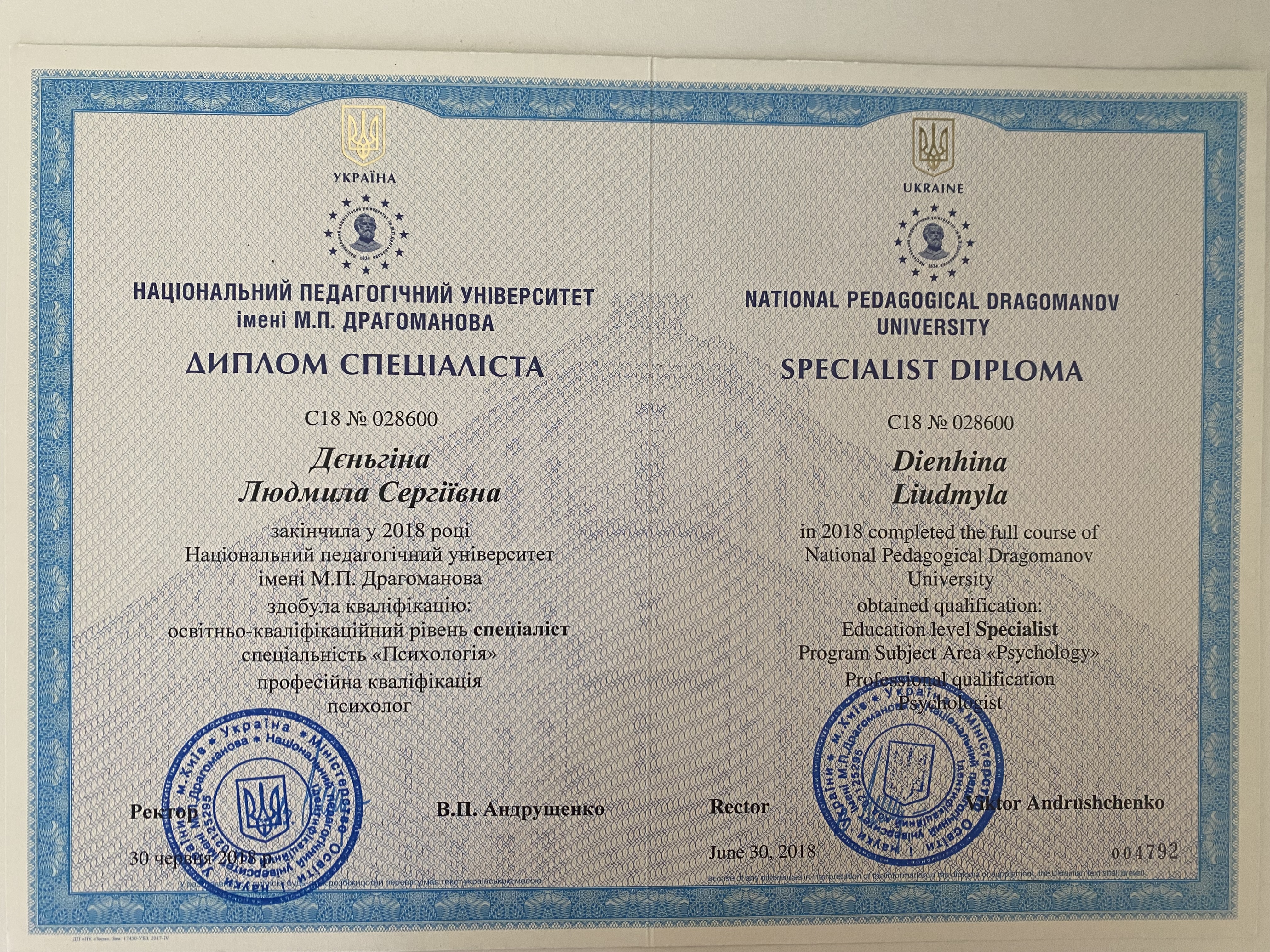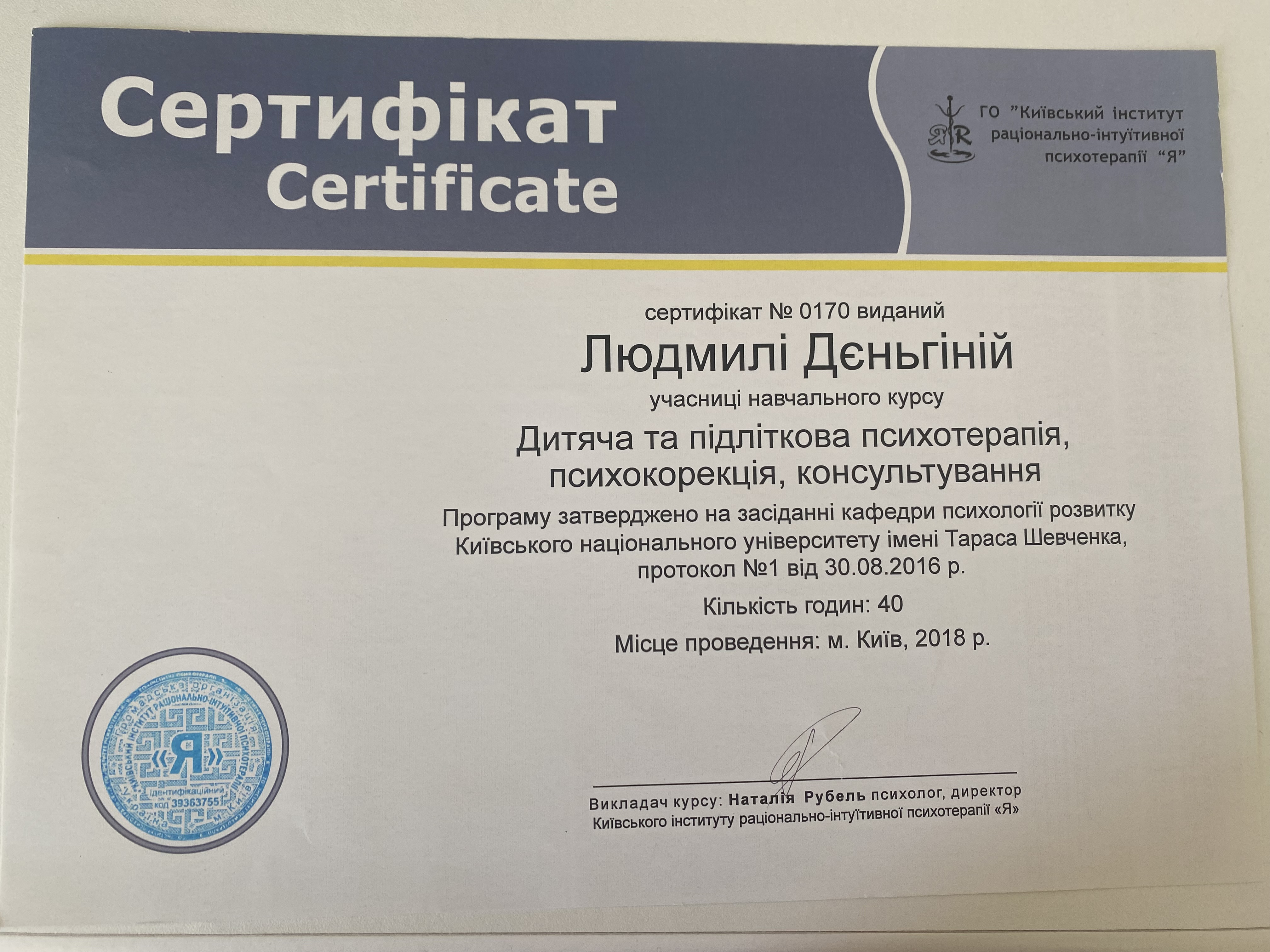 - Сертифікат Дитяча та підліткова психотерапія, психокорекція, консультування. з 2018 року