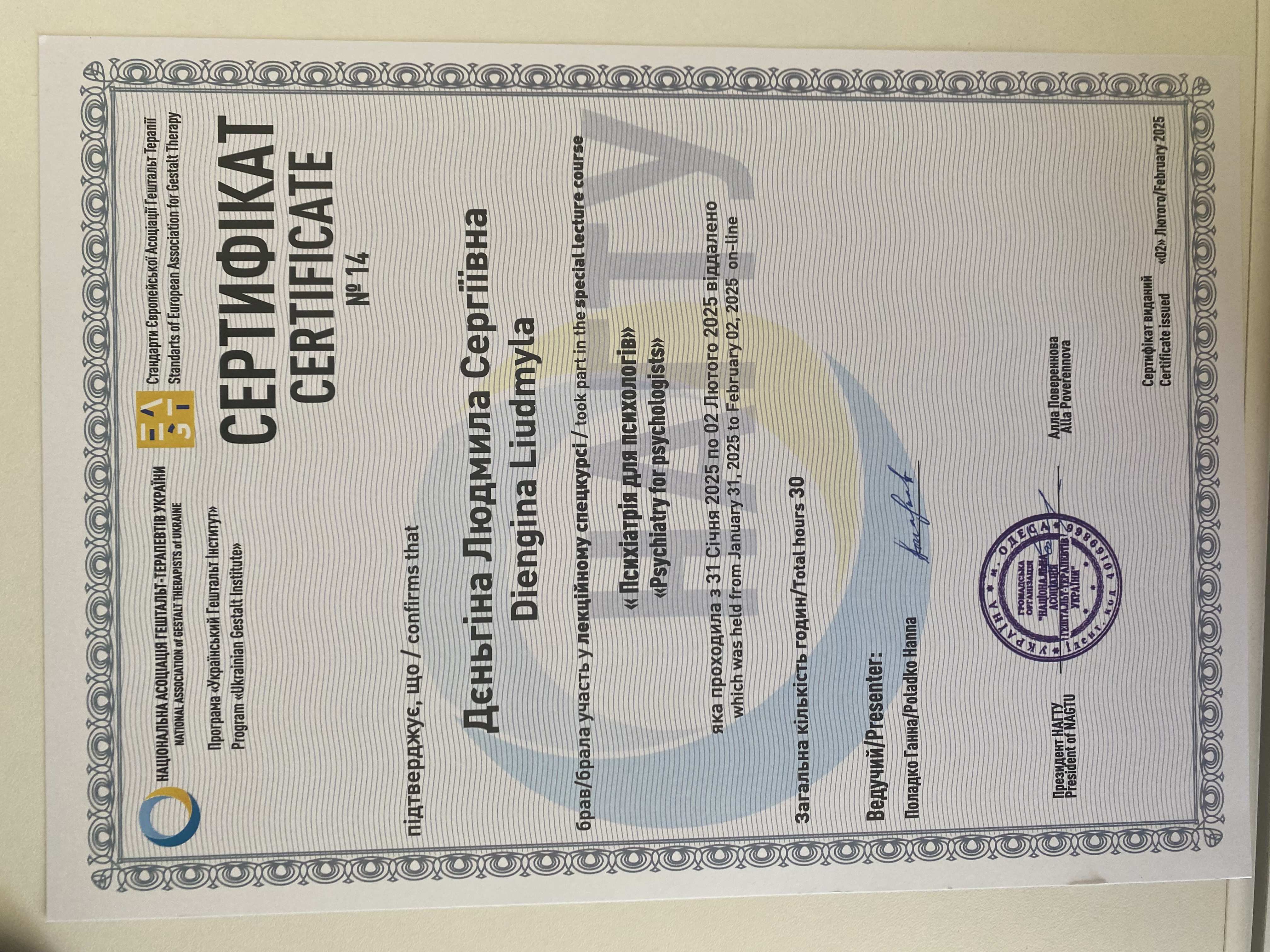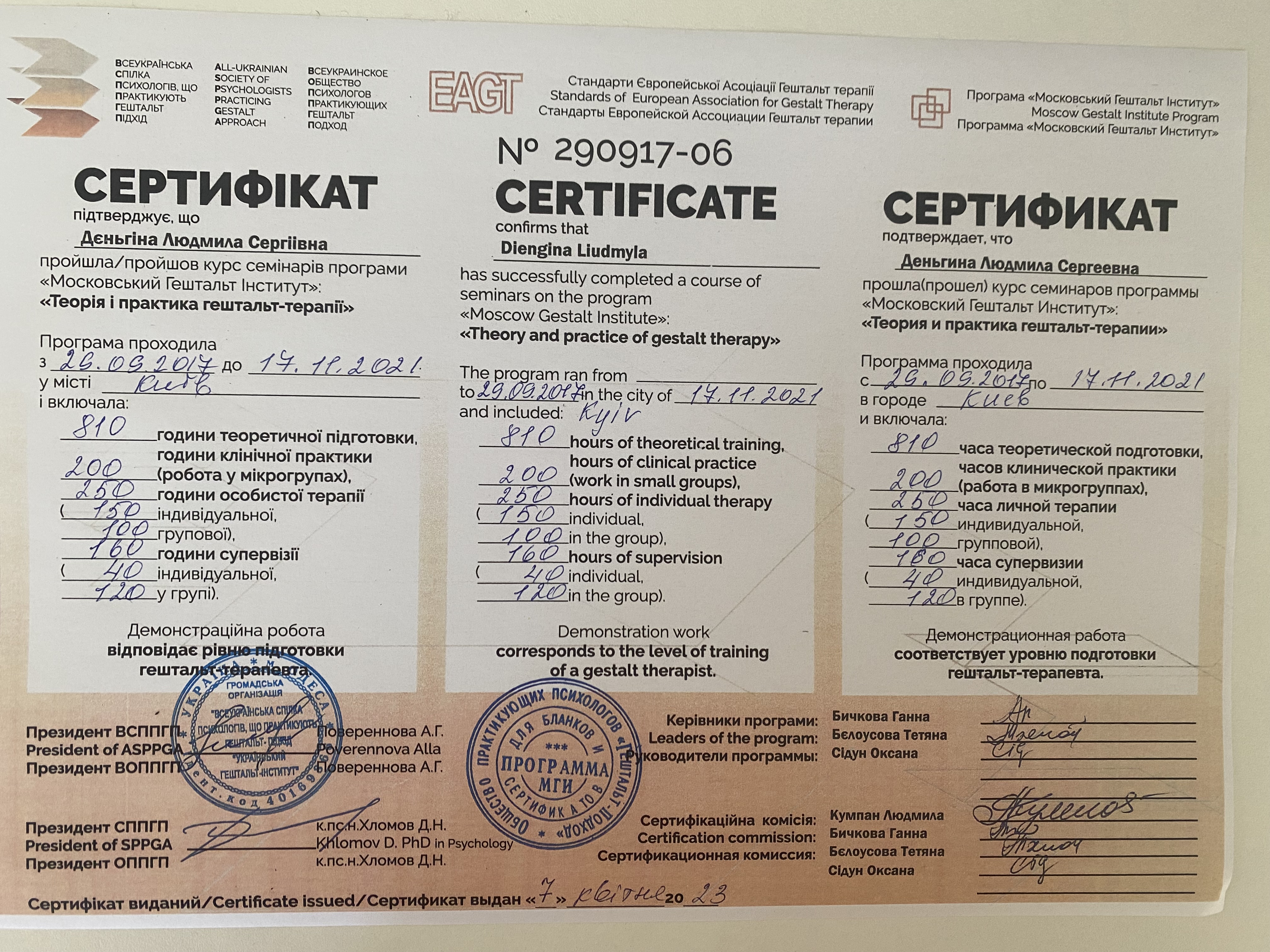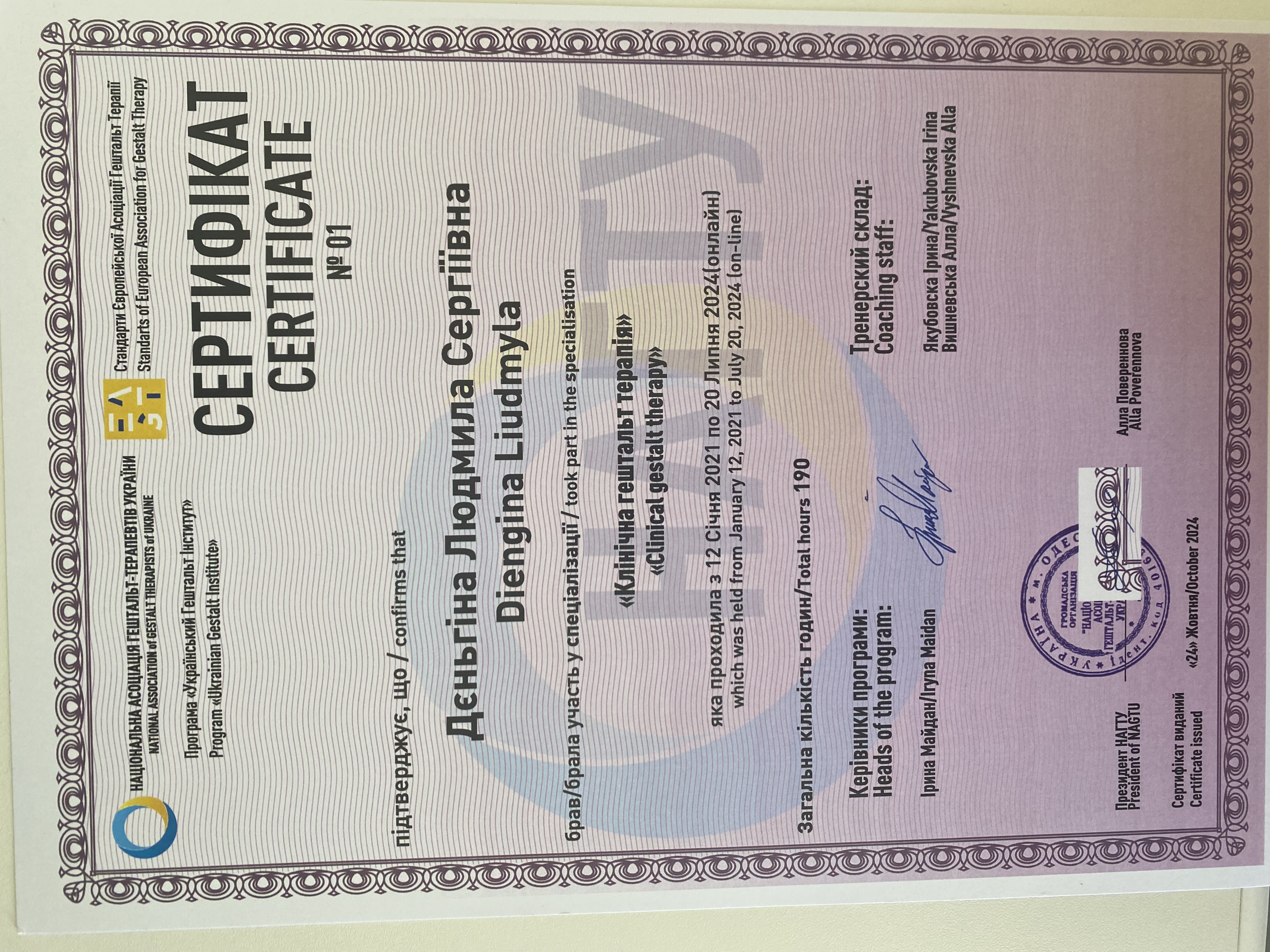 - Сертифікат Клінічна гештальт- терапія з 2024 року
